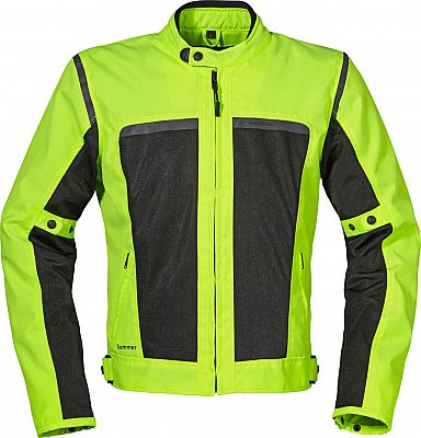 Breathable summer jacket with large air mesh areas Features Protectors on shoulders and elbows certified to EN 1621-1 removable Special foam padding at the back removable FF back protector – certified to EN 1621-1 or EN 1621-2 Reflective material Upper arm width adjustment by push buttons Two outside pockets Two interior pockets Flexible Soft Snap collar closure