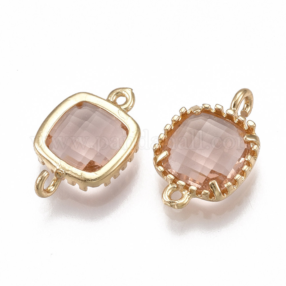 Glass Links/Connectors, with Brass Findings, Faceted, Square, Golden, PinkSize: about 14.5mm long, 9.5mm wide, 3.5mm thick, hole: 0.8~1.2mm.