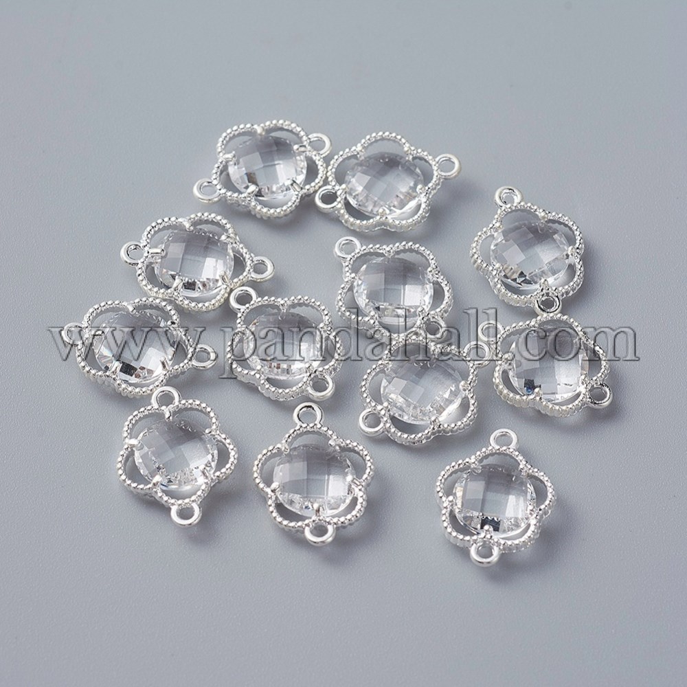 Glass Links/Connectors, with Environmental Alloy Open Back Berzel Findings, Faceted, Flower, Silver, ClearSize: about 12mm wide, 15.5mm long, 3mm thick, hole: 1.4mm.