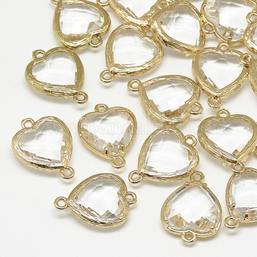 Glass Links/Connectors, with Golden Tone Brass Findings, Faceted, Heart, ClearSize: about 15mm long, 10mm wide, 3mm thick, hole: 1mm.