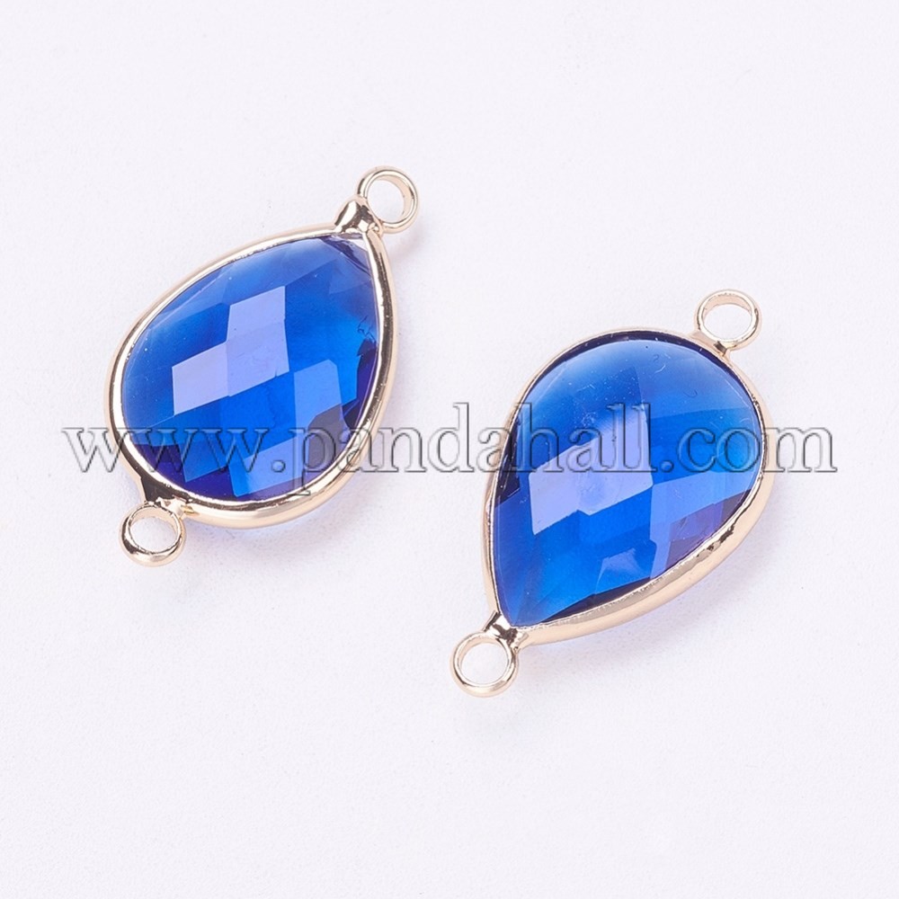 Glass Links, with Brass Findings, Faceted, Drop, Light Gold, RoyalBlueSize: about 14mm wide, 25.5mm long, 6mm thick, hole: 2.5mm.