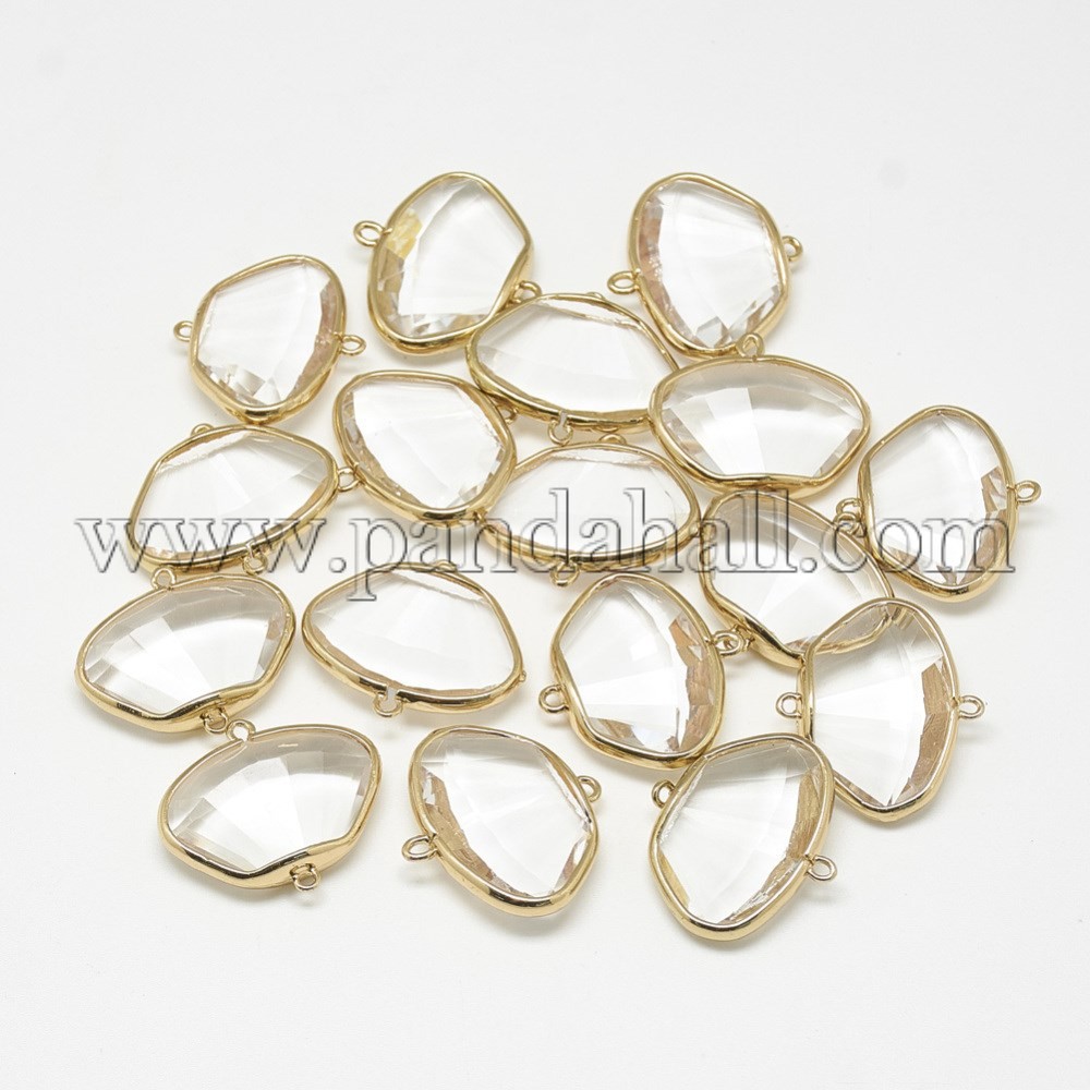 Glass Links, with Golden Tone Brass Findings, Faceted, Trapezoid, ClearSize: about 22mm long, 24.5mm wide, 7mm thick, hole: 1mm.