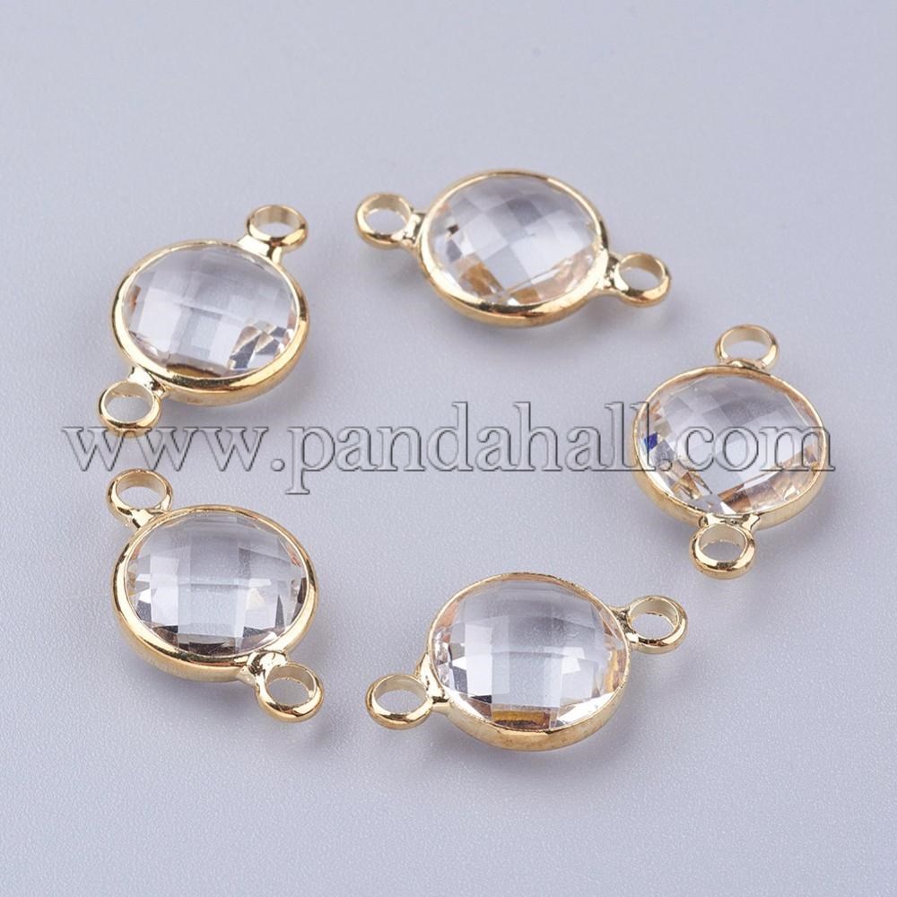 Golden Tone Brass Glass Links/Connectors, Faceted, Flat Round, ClearSize: about 8.5mm wide, 15mm long, 3.5mm thick, hole: 1.5mm.