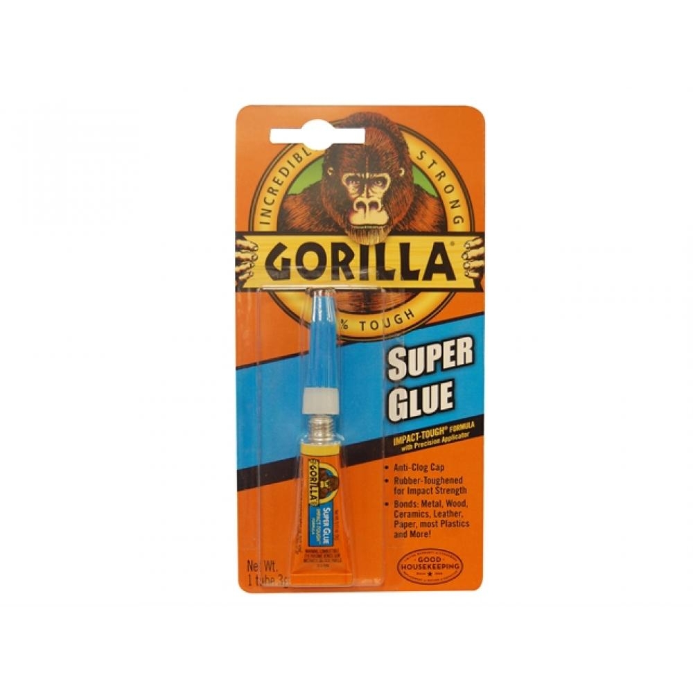 Gorilla Super Glue is a super glue that keeps holding strong, even when the bond takes a hit. Just hold in place for 30-60 seconds while the formula sets, no clamping necessary. Features include:IMPACT STRENGTH – unique rubber particles increase impact-resistance and strength to handle everyday use after your repair or creation is set. WON’T CLOG – anti-clog tip with metal pin keeps nozzle clean. EASY TO USE – thick formula flows better for improved control. Dries in just 30-60 seconds, with no clamping. WHATEVER THE SURFACE – use on nearly anything, from wood, metal, ceramics, some plastics, rubber and a whole lot more!Size: 3g.