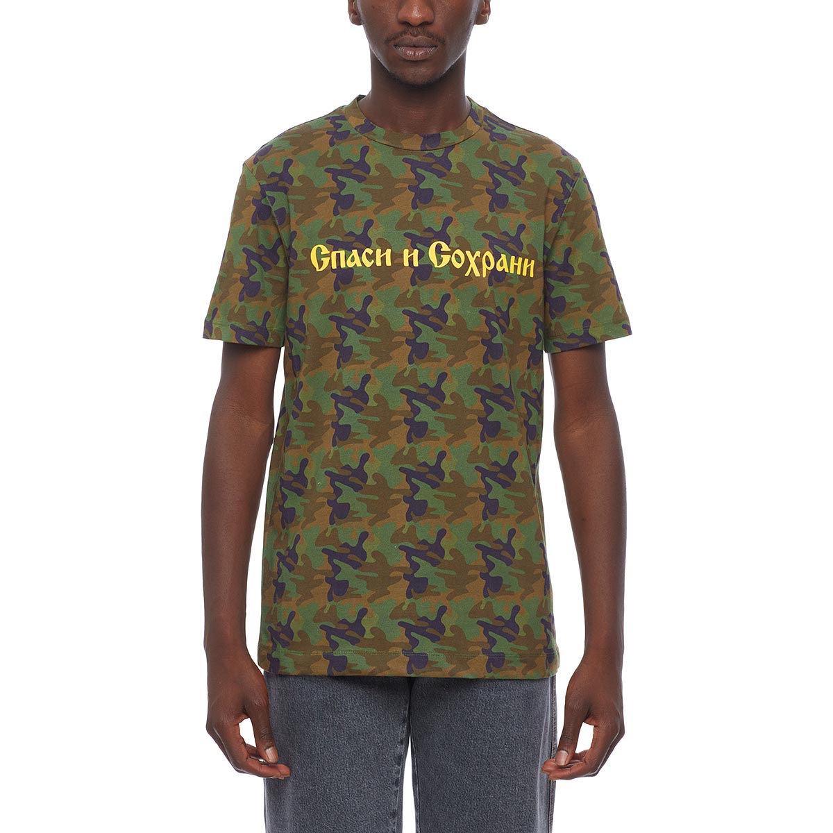 Save and survive t-shirt from the F/W2016-17 Gosha Rubchinskiy collection in camouflageThis t-shirt from Gosha Rubchinskiy new collection comes in a comfortable fit. The crew neck t-shirt, here in camouflage, is made of cotton and features a print at front.- Printed t-shirt- Crew neck- Composition: 100% Cotton- Made in Turkey- Code: G009T012 A- The model is wearing an international L size
