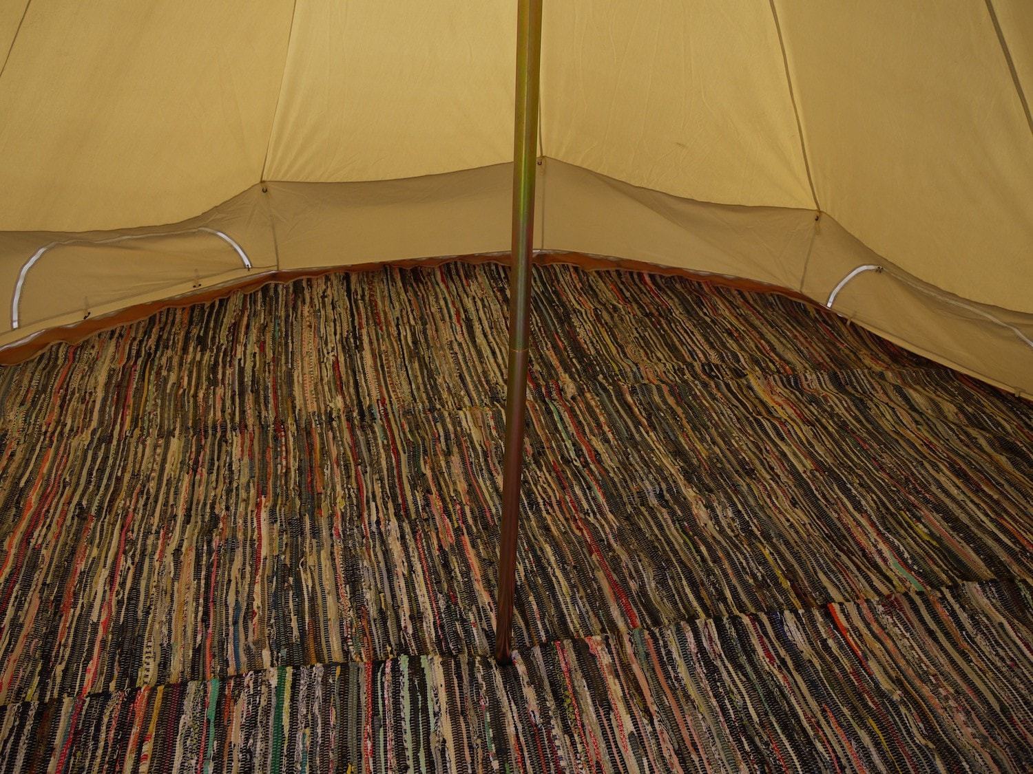 Designed by Bell Tent Boutique A practical alternative to coir mats Hand loomed mats designed to create a stylish floor covering for your tent Warm and soft on the feet Easy to transport & store Available in half moon and full moon rugs (a pair of half moons) for the last word in luxurious camping 20cm smaller than your tents diameter to fit within the groundsheet Each mat comes with its own cotton drawstring bag for packing away Each mat is unique as its hand made Each Half Moon rug weighs 3m – 7.5kg, 4m – 13kg, 5m – 17.5kg, 6m – 28kg Packed up measurements 5m half moon 80cm x 60cm x 20cm