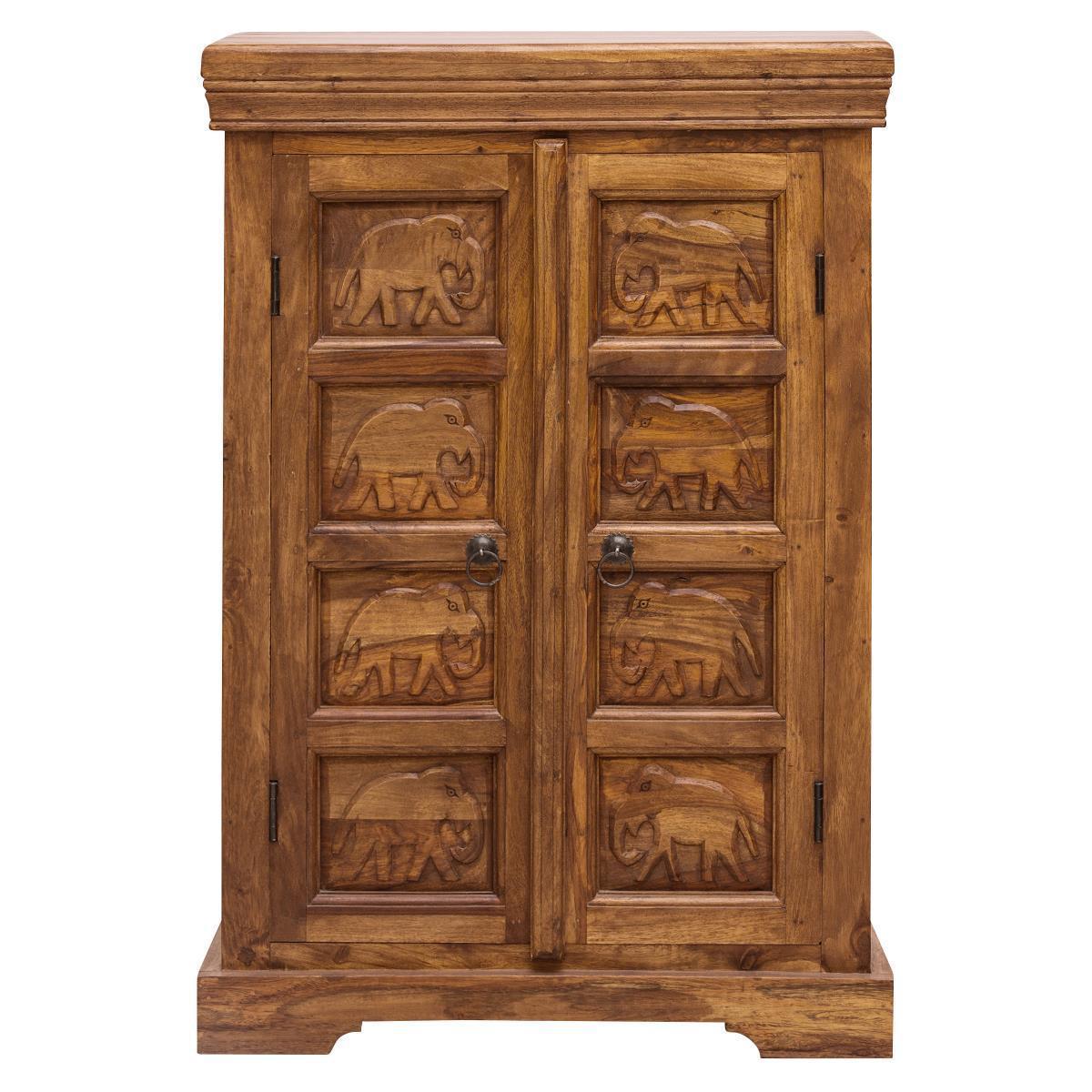 Eight individually hand carved elephant panels adorn this double-door wooden cupboard. Handmade from sustainable Indian sheesham wood by our fair trade friends. Each elephant character expertly carved in relief and framed to augment the three-dimensional effect, finished in a lustrous wax that brings out the natural wood grain. Featuring a carved plinth & top and aged ring handles, the full-width cupboard has double doors and one fixed, mid-height shelf, perfect for easily accessed, organised storage. At home in any environment; hallway, bedroom or living, this as a masterpiece of outstanding appeal combining beauty and practicality. 100% Sheesham wood (Indian Rosewood) with a hand waxed finish. Fair trade furniture imported directly from Northern India.
