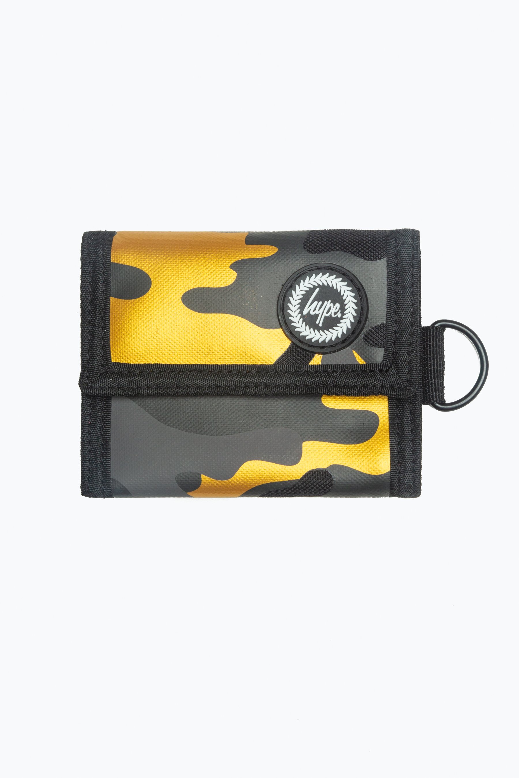 The HYPE. gold camo wallet is the ultimate supreme wallet you need in your life. Featuring our signature camo print entwined in greys, blacks and pops of gold. A unisex wallet shape and design, creating the perfect lightweight wallet you need as your money and card holder. Don’t stop here, grab the matching backpack and pencil case to complete the set. Wipe clean only. Color Multi Pattern Camo Gender Unisex Closure Type Velcro Closure Care Instruction Wipe Clean Only Dimensions 11. 5cms x 9cms x 1cm Model Name BLACK MAXI Inner Material Type Branded inner lining – polyester Print Type Sublimation | Hype Gold Camo Wallet