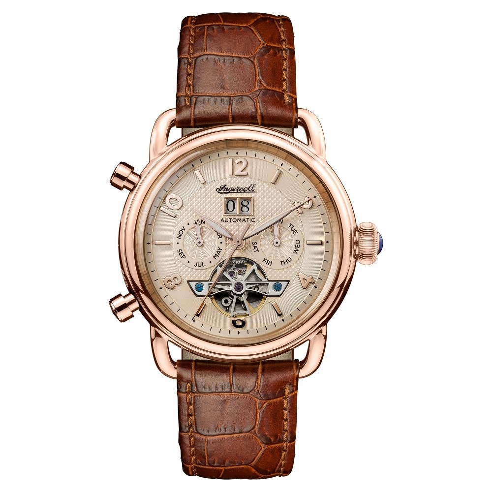Ingersoll I00901 The New England Automatic Wristwatch Case Diameter: 42mm Case Depth: 15mm Case Material: Stainless Steel Case Colour: IP Rose Gold Dial Colour: Cream Strap Width: 21mm Strap Material: Genuine Leather Strap Colour: Brown Clasp Type: Push Button Clasp Movement: Automatic Water Resistance: 5ATM Glass: Scratch Resistant Mineral Glass Functions: Month Day and Big Date Includes: Ingersoll watch, presentation box, instruction manual & Lifetime warranty. A standout of the New England watch range with a distinct balance wheel feature, the New England I00901 is the perfect watch for a stylish gentleman. Its quartz powered movement gives it precise functionality. We are an Ingersoll UK authorised dealer Brand new boxed stock with full retail boxes & paperwork Lifetime Limited warranty
