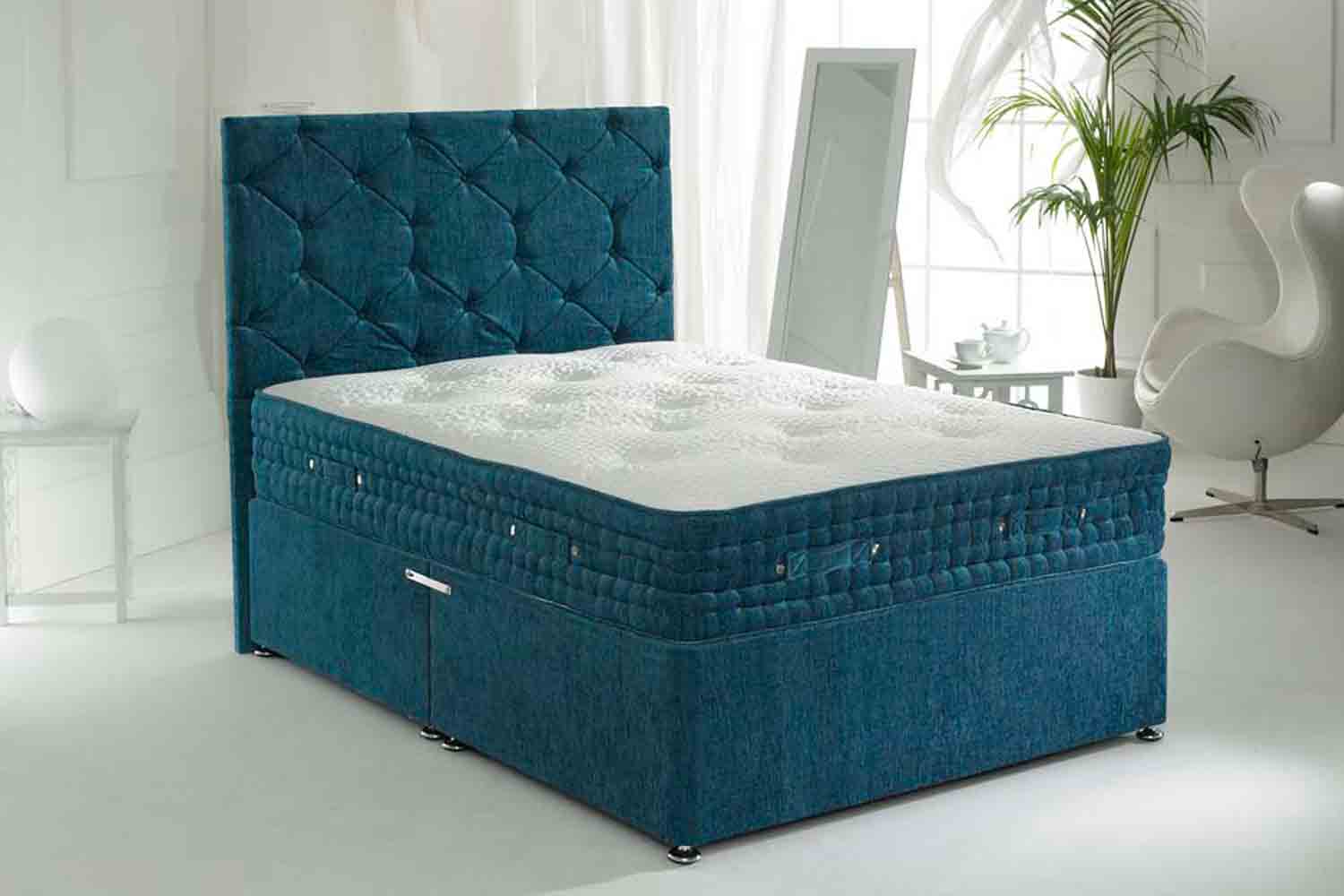 Unique in the Sterling range, the Sterling 6000 Pocket Sprung Divan Bed is topped with pressure-relieving memory foam. This doesn’t only give a luxury feel but also relieves aches and pains and helps to improve circulation ensuring a restful night’s sleep. The Sterling 6000 Divan Bed is hand-tufted and hand-stitched, the Sterling 6000 is also constructed with 6000 pockets and 50,000 convolutions of springs creating a mattress can of great quality. Just like all of the beds in the Sterling range, this mattress can be made in a number of attractive colours and the matching divan base is available with side or end storage in any combination that may requested.