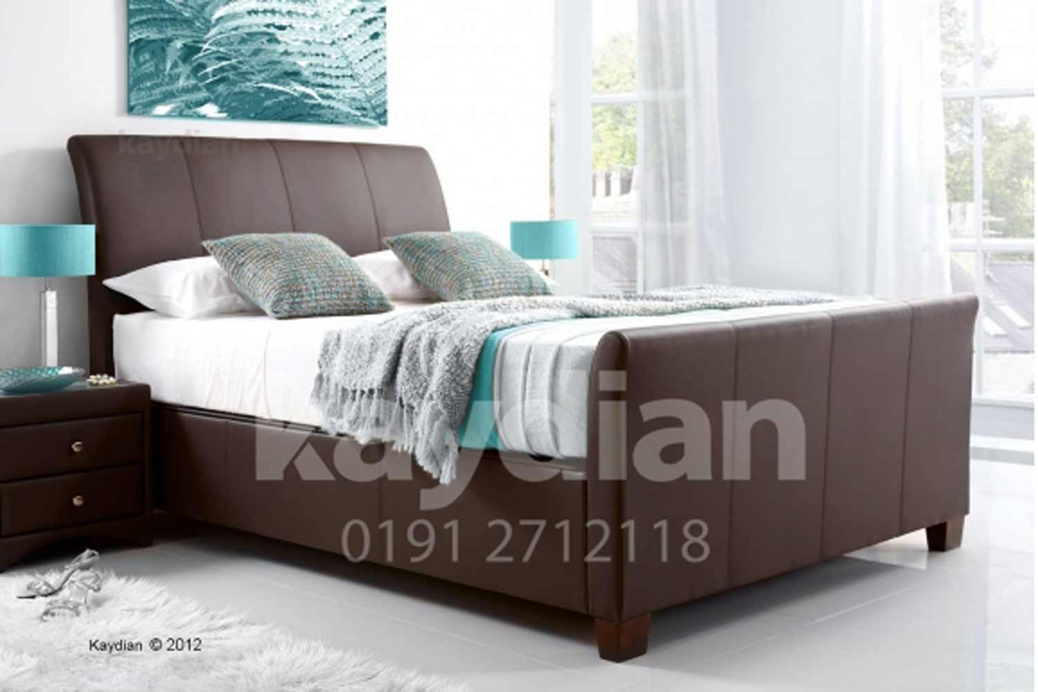 The Allendale Ottoman Bed is a fabulous addition to the high quality Kaydian collection of beds. The frame offers a stylish look for the bedroom along with bringing a selection of storage space. The Allendale is upholstered in brown madras leather and features a high curved headboard and footboard which both feature vertical detail stitching. This stylish ottoman storage bed manufactured with a new lift-up system offers a spacious floating floor storage area with elegant hardwood feet. The storage area is maximised by the ingenious design of extra deep side rails. The Allendale has a platform style ventilated base. Maximum mattress weight 55KG.