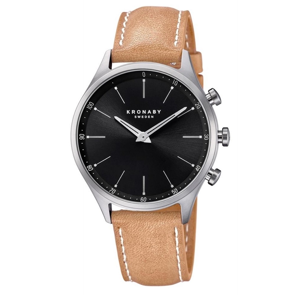 CASE 41 mm, Stainless steel 316L HANDS Silver coloured with Super-LumiNova MOVEMENT Kronaby connected movement BT003, one sub dial, Bluetooth 5.0 Low Energy (BLE), vibration motor, accelerometer ARTICLE NUMBER S3123/1 CRYSTAL Double domed sapphire crystal with AR coating BRACELET 20mm brown Italian leather strap, Stainless steel buckle, quick release spring bars BATTERY Battery Life up to two years (depending on use), CR3032 coin cell DIAL Blasted finish, black plated with printed numerals WATER RESISTANT 10 bar/ 100 meters APP Kronaby App working with (or later version) Android 5.0 and iOS 9 FEATURES Automatic time zone, Filtered alerts, Call rejection, Lost watch, Long session monitoring, Silent alarm clock, Second time zone, Pedometer, Timer, Stopwatch, Camera control, Music control, Take me home, Find phone, GPS positioning, This hybrid smart watch is made from double domed sapphire crystal and 316L stainless steel. Brown leather strap completes the piece Once connected to your smartphone via Bluetooth, the magic begins. with features covering many aspects of your daily routines. It even shows the time. Water resistant to a 100 meters, a battery life of up to 2 years.