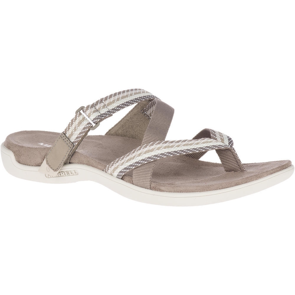 This sandal boasts a Microfiber wrapped contoured EVA footbed which provides upmost comfort for the duration of the wear. Multiple straps provide stability whilst the Heel of the flip flop has a Merrell Air Cushion to provide protection from any shock from uneven surfaces. A great sandal for all day wear., Textile upper ., Microfiber wrapped contoured EVA footbed ., Merrell Air Cushion in the heel absorbs shock and adds stability., M Select GRIP outsole tunes each outsole with durable traction that grips when and where you need it.