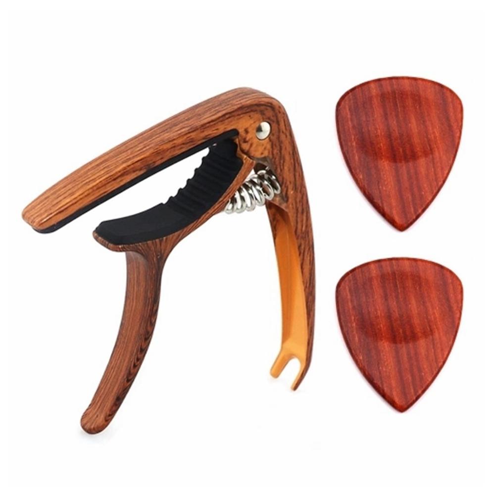 Features:This tools set includes metal capo(wood grain) and 2pcs natural wood picks.Smooth clamping allows the capo for fast and convenient key changes with one hand.With pin puller capo tail design, to pull bridge pin directly without damaging your guitar.Suitable for acoustic guitar, folk guitar, classic guitar bass guitars, banjos and ukulele, etc.The picks are made of natural wood, with beautiful natural wood grain.Specifications:Color: Capo: wood grain, pick: natural grainMaterial: Capo: metal, pick: woodCapo size: 9 * 7 * 1.25cm / 3.54 * 2.76 * 0.49inPick size: 3.2 * 2.7 * 0.25cm / 1.46 * 1.06 * 0.10inItem weight: 67g / 2.36ozPackage size: 13.5 * 10.2* 1.5cm / 5.31 * 4.02 * 0.59inPackage weight: 87g / 3.07ozNote:The picks color and grain may differ from one to another because of being made of natural wood. Please in kind prevail.Package list:1 * Capo2 * Picks