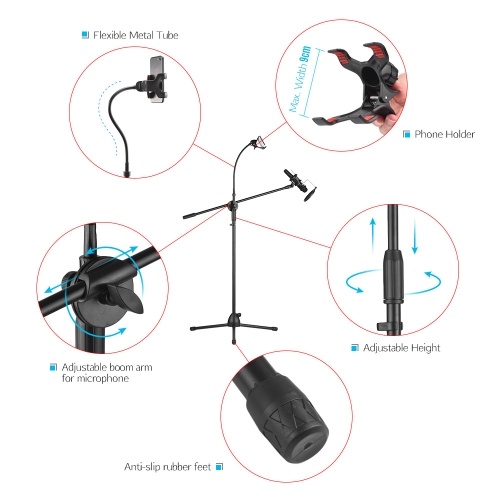 72cm/28.3in boom arm for microphone, and the users can adjust the boom to the best usage angle during performance; comes with 3 mic holders for different microphones.