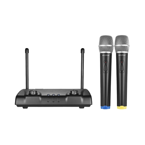Features: Wireless microphone system with 2 handheld microphones and 1 compact size receiver. Using VHF band frequency 211.0-213.5MHz to avoid interface. Adopts SMT technology and multiple noise control circuit to ensure high performance and low distortion. The receiver with 2 control knobs for adjusting the volume of the microphone separately, easy and flexible to use. Max. effective transmission range in open area is about 60 meters, suitable for public speech, ballroom karaoke, home entertainment, classroom teaching, business meeting, etc.