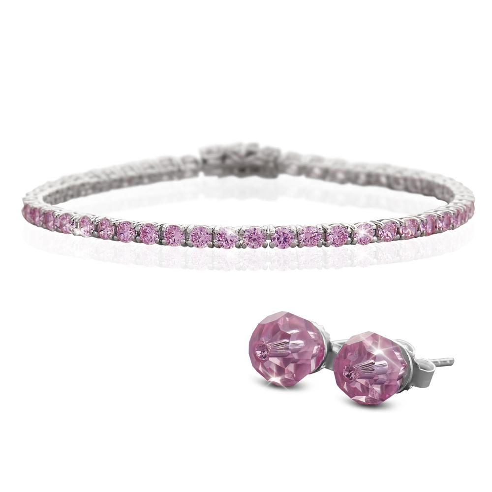 The Argyle Mine in Western Australia produces around 90% of the Worlds Pink Diamonds. These are rare and extremely expensive with even the smallest versions hitting six figure values. We bring you the same look but at a more affordable price. Sterling silver holds 51 round brilliant pink Diamondeau® – the Supreme Diamond Alternative in this 7 Inch classic tennis bracelet. So called when famous tennis player Chris Everett hit the headlines after losing her diamond bracelet during an important game back in 1987. Buy the bracelet and take advantage of this special offer of 8mm faceted pink earrings for a dollar.