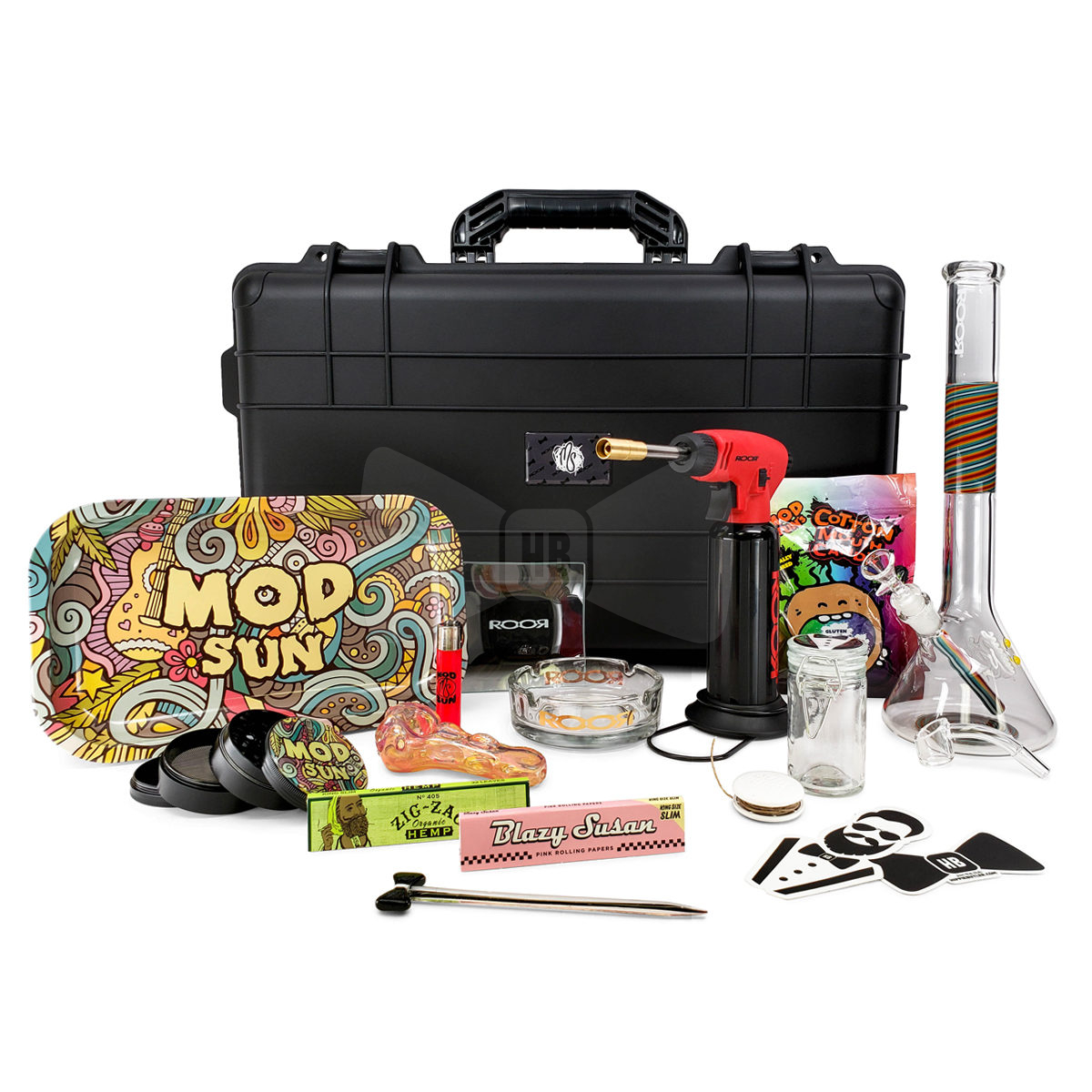 The first round of limited edition boxes will start shipping about February 15th** Your Hippie Butler is proud to present, in partnership with our good friends Mod Sun and RooR Pure Smoke Kulture, the most Opulent Box we have ever offered! This limited edition box features the very best products the high end smoking world has to offer, all packed into a one-of-a-kind case. We couldn’t wait to work with Mod Sun himself, the original creator and artist behind the Mod Sun Brand that brings bright and whimsical patterns, positive happy energy, and high quality accessories to your smoke sessions. Use the fun Mod Sun rolling tray with your matching Mod Sun grinder, and become the life of the party (dare we say hero?) when you share your delicious Cottonmouth Candies with your friends. Of course Hippie Butler also had to include RooR, the world renowned German glass maker, and their beautiful hand blown glass. Each case includes a unique 12″ Water Pipe signed by the maker and glass banger attachment, as well as a high quality RooR torch and glass ashtray to start. Of course your Butler made sure not to leave you wanting for anything so we were sure to include the little things that make every smoke session complete. Show up to your next smoke circle with your custom roller case of goodies and we guarantee youll be the envy of everyone there. So grab this one time, limited edition box and be one of the exclusive few to elevate their smoking game to a whole new level. These limited edition Mod Sun boxes are specially crafted for our customers and can take up to 4 weeks to ship. Included in Box: Mod Sun Large Rolling Hard Case Mod Sun Rolling Tray Mod Sun Large Grinder Mod Sun Clipper Lighter Mod Sun Cotton Mouth Candies Mod Sun Glass Spoon Pipe RooR X Mod Sun 12″ Water Pipe RooR Torch RooR Glass Circle Ashtray RooR Small Glass Tray RooR Glass Banger Blazy Susan King Size Papers Zig Zag Hemp King Size Papers Hippie Butler Mini Quik Wikk Hippie Butler Bowtie Dabber Hippie Butler Glass Jar Hippie Butler Bowtie Stickers