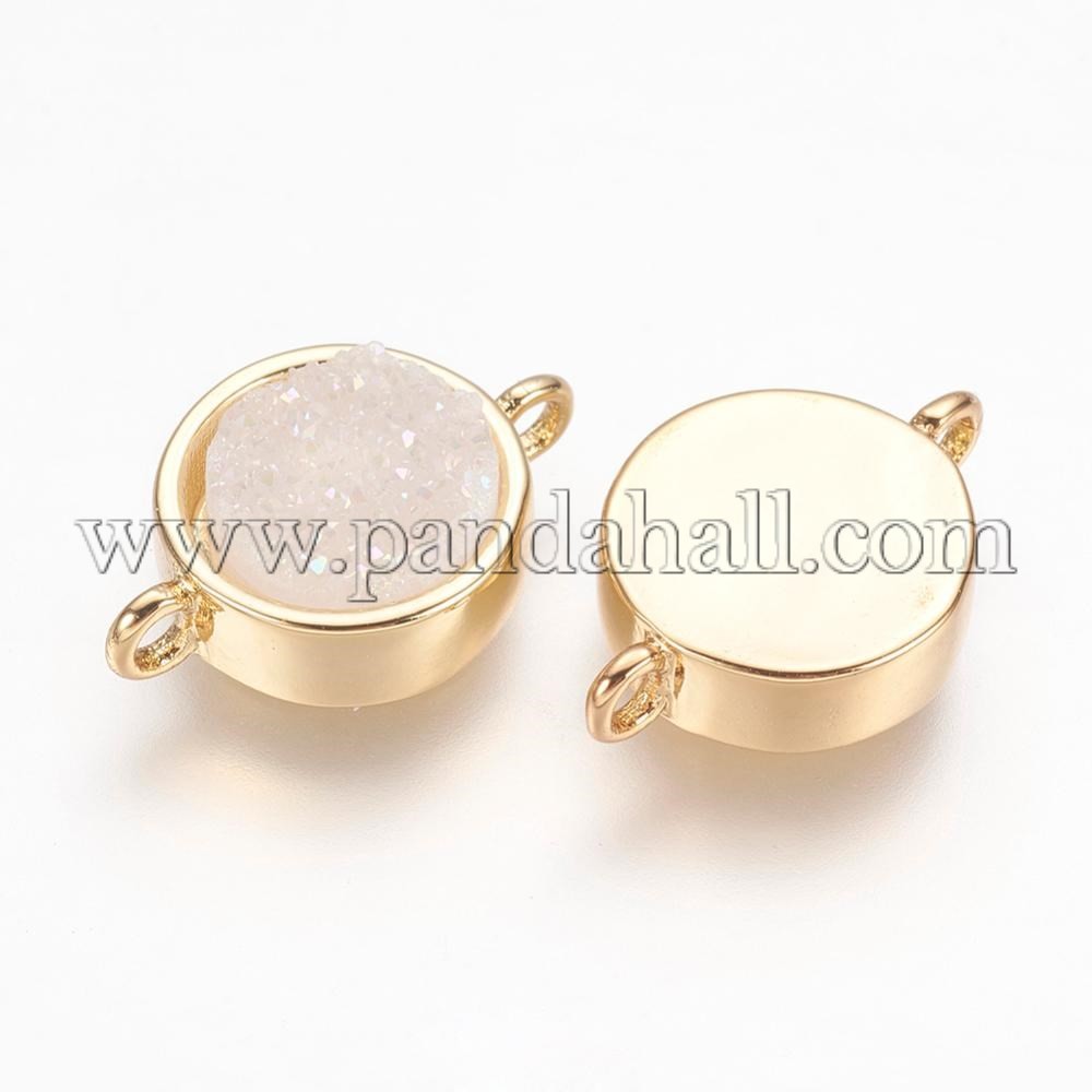 Natural Druzy Agate Links, with Real Gold Plated Brass Findings, Flat Round, Dyed, GhostWhiteSize: about 10mm long, 15.5mm wide, 3~3.5mm thick, hole: 1mm.