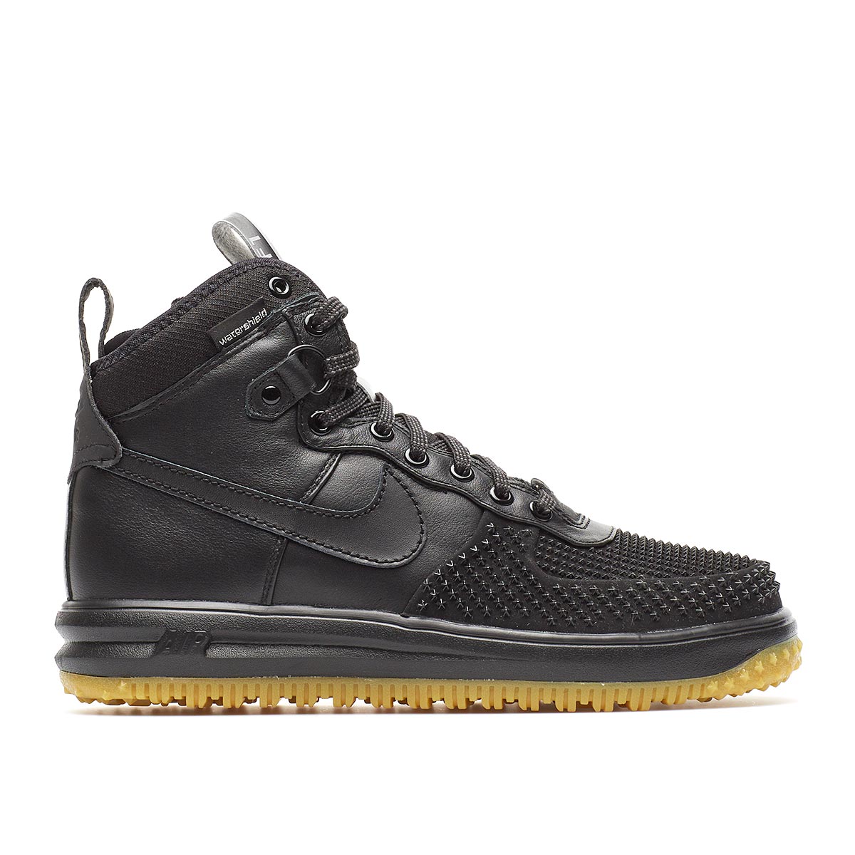 Nike Lunar Force 1 Duckboot from the Holiday ’16 in blackThis Lunar Force 1 Duckboot is from Nike collection. This sneaker, here in black, features iconic Air Force 1 design details, a water-repellent premium leather and a WaterShield lining for a dry and comfortable feeling, Lunarlon midsole and encapsulated Air-Sole heel unit for lightweight cushioning.- Water repellent upper- Air Force 1 design detail- Lunarlon midsole- Encapsulated Air-Sole heel- Sizing: Footwear (USA)- Nike code: 805899-003