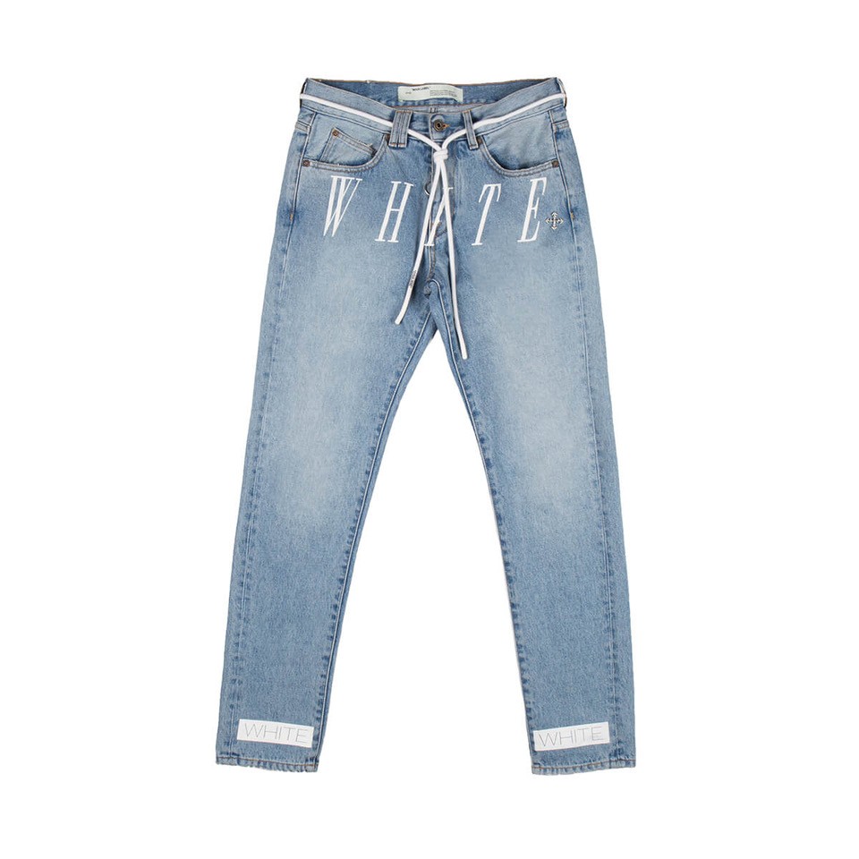 Slim Denim pants from the Pre F/W2019-20 Off-White c/o Virgil Abloh collection in light blueThese denim pants from Virgil Abloh’s Off-White new collection come in a slim fit. The slim jeans, here in bleach blu, feature a zip and button closure, five pockets, a print at front and details at back.- Denim pants- Zip and button closure – Five pockets – Removable white cord – Details at back- Code: OMYA011E19386045 7128