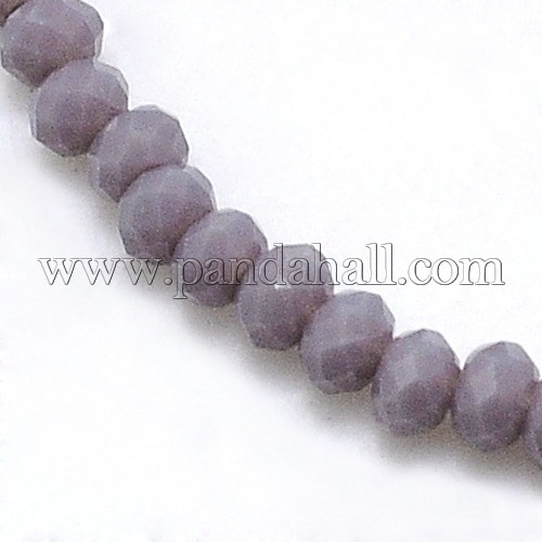 Opaque Solid Color Crystal Glass Rondelle Beads Strands, Faceted, MediumPurpleSize: about 3mm in diameter, 2mm thick, hole: 1mm, about 138pcs/strand, 12.9″.These glass beads may give you a feeling of elegant and exquisite. They can be used many ways – such as jewelry, strung in your window, and also are ideal for necklaces, bracelets and so on.