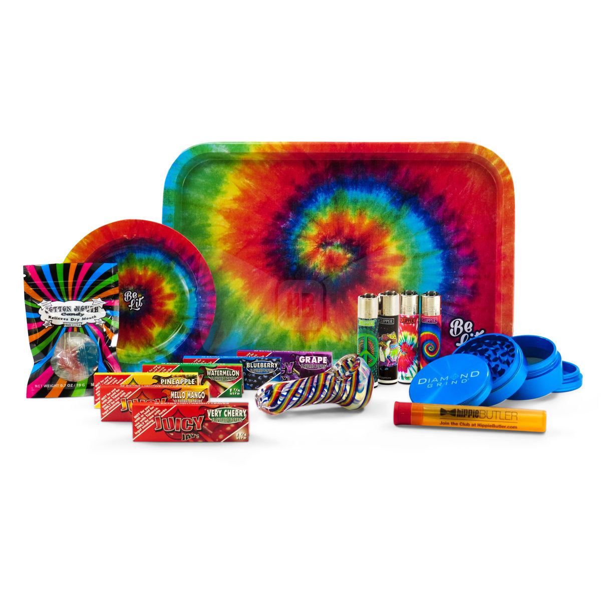 Youll be over the rainbow with joy when you open up and enjoy a smoke with this perfectly crafted tie-dyed bundle! Offering you a wide array of accessories to enjoy your smokes with, this bundle has all of your bases covered so that you can sit back and bask in its glory. With the matching rainbow tie-dye metal 11″ x 7″ rolling tray and 5″ ashtray, you can make sure that all of your smoking goodies stay neat and organized right where you need them without worry. Grind your favorite legal smoking herbs to perfection with the 4-piece 56mm Diamond Grind, made of aircraft-grade aluminum that as long-lasting as it is vibrant! Then, you can pick to enjoy your smokes with one of your favorite mouth-watering flavor of Juicy Jays 1 1/4 rolling papers – Grape, Blueberry, Watermelon, Pineapple, Mango, and Cherry – and get the flavorful and bright smoking experience that you crave. Or, go the other route and enjoy your smokes with the masterfully crafted and durable spoon pipe, fitting comfortably in your hand and offering you a spectrum of colors to enjoy while you smoke from it. Simply light up with the vibrant and easy to love set of 4 clipper lighters, featuring an easy to refill and reuse design that makes you smoking that much better. Then, when all is said and done, store what you need to in the air-tight plastic doob tube and you are ready to go. To really sweeten the deal, this bundle includes a pack of Cotton Mouth Candy, each one packed with wonderful fruity flavors that are sugar, gluten, and fat-free so that you can indulge again and again. This bundle is the perfect way to brighten up anyones day! Doob tube and grinder colors may vary!