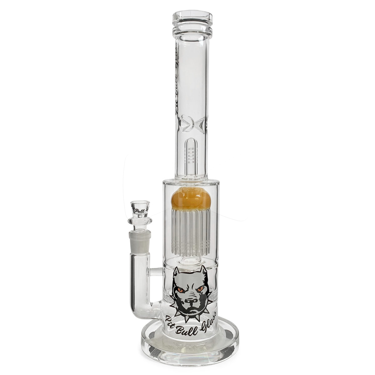 These gorgeous Pit Bull 15″ Honeycomb and Tree Perc pipes will take your favorite legal smoking herbs and elevate it to new heights. The intricate filtration system in each piece churns your smoke through cool water, that removes impurities and cools each draw. The smoke then passes over the triple ice pinch which is built to conveniently hold 2-3 pieces of ice, further cooling your draw before it reaches you. This commanding piece will stand tall amongst your glass collection and is sure to be your new favorite. This glass piece has a 18mm male joint that will fit 18mm female accessories and replacements.