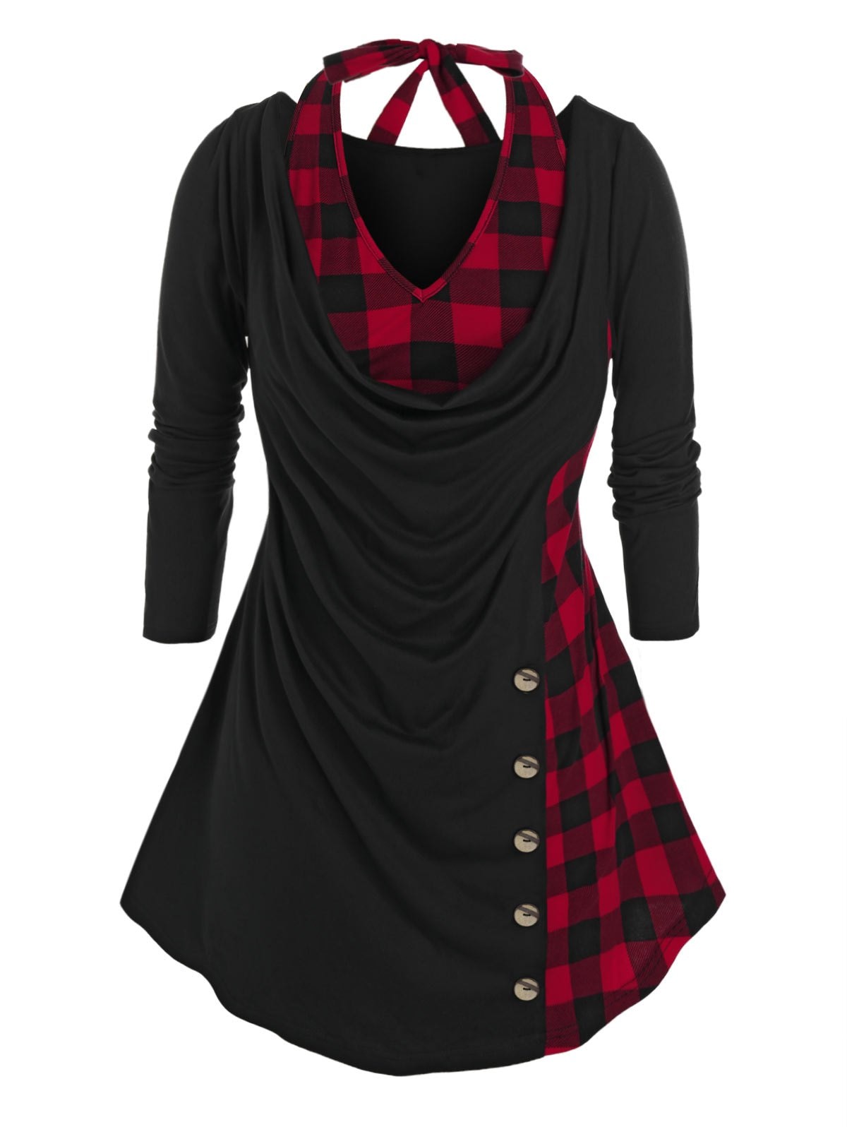 Plus Size Cowl Front Plaid 2 in 1 T-shirt