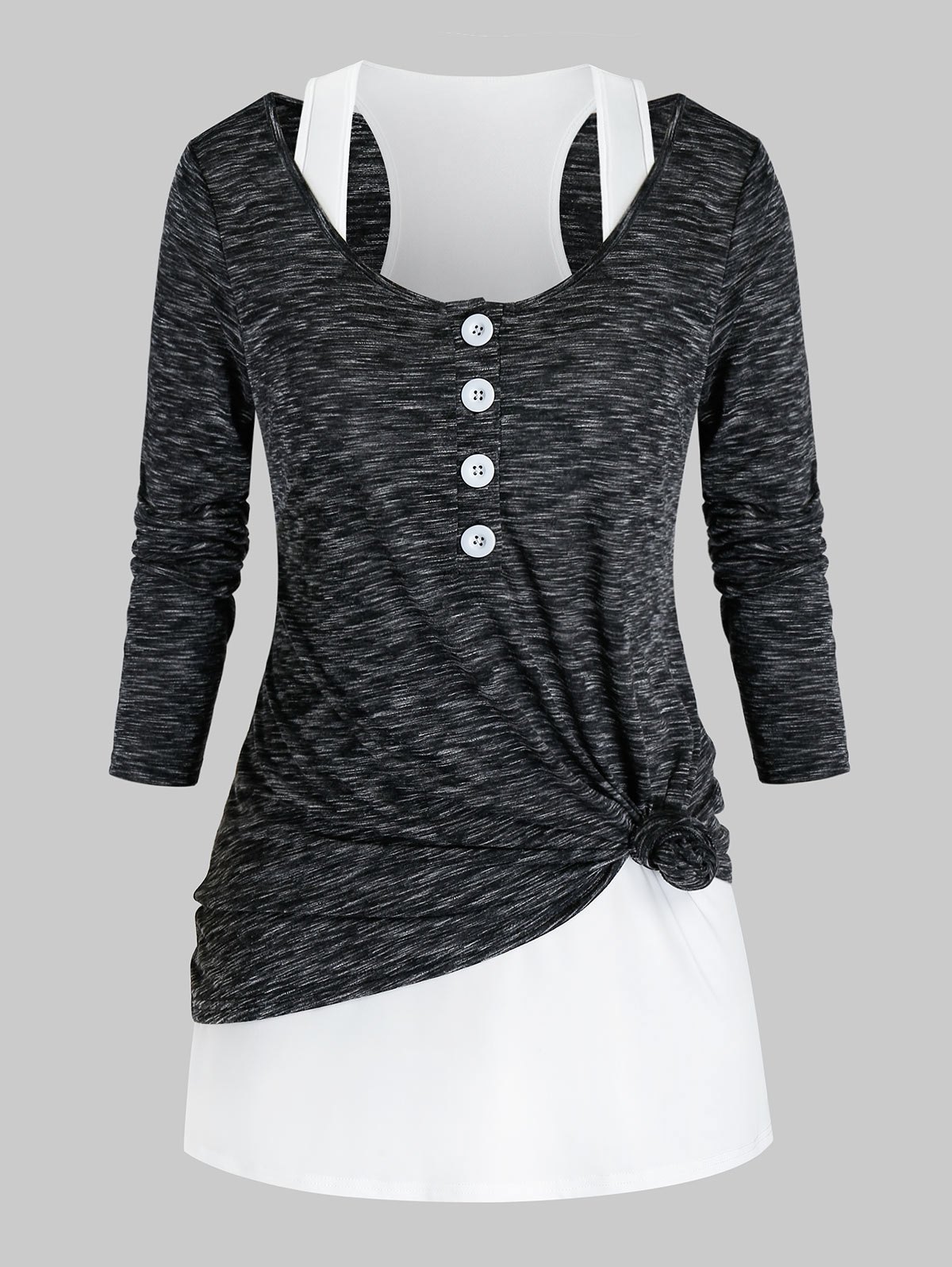 Plus Size Space Dye Placket Knot T-shirt and Racerback Tank Top Set