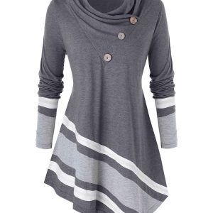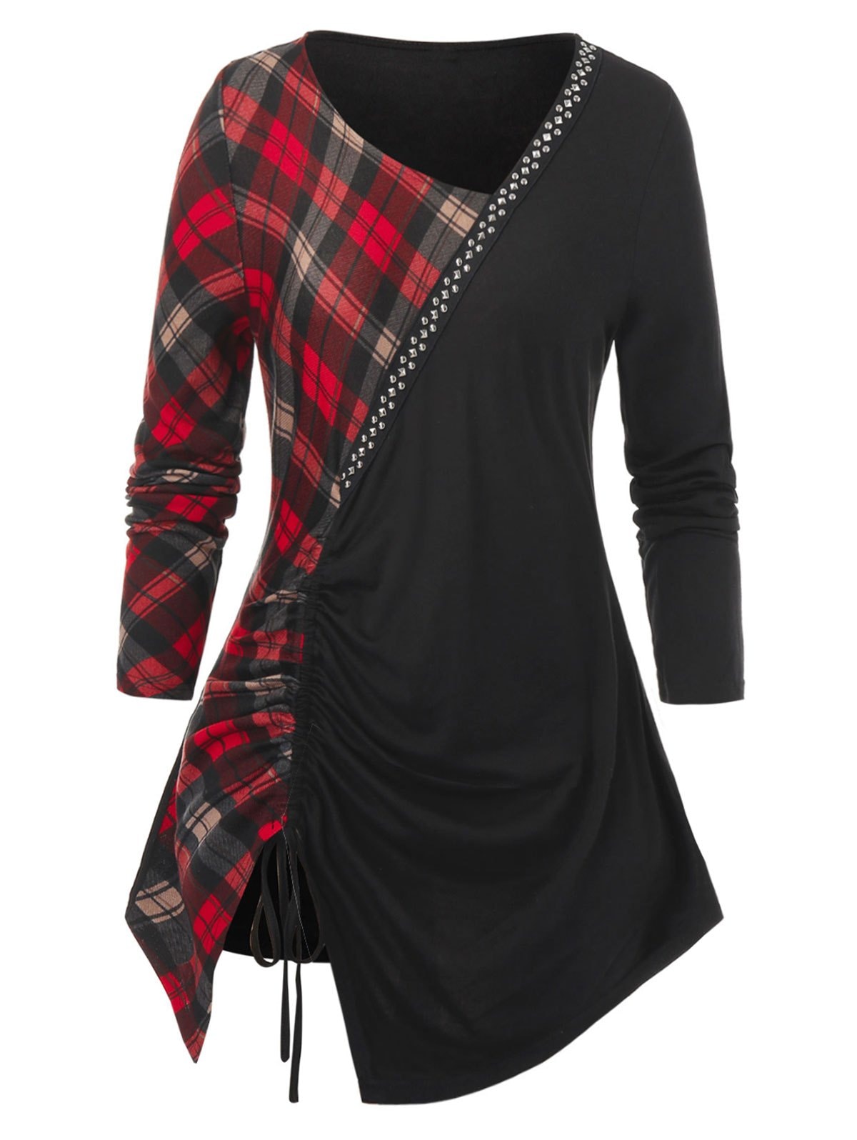 Plus Size Studded Plaid Cinched Skew Collar Tunic Tee