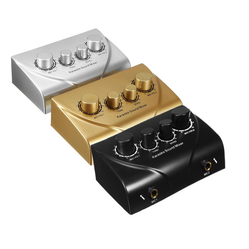 Professional Mini Karaoke Audio Mixer Dual Mic Inputs with Cable for Stage Home KTVFeatures:1.2 microphone inputs,video input and sound output for video signal,volume can be adjusted individually2.For Echo effect and 2 microphone controls3.Small, beautiful, portable, good quality4.Suitable for company, stage, home, KTV rooms, etc5.With AV inout, can connect to PC or TV or AmplifierDescription:Input: AC100-240V/50-60HzOutput: 12V/600mAColor: Black/Sliver/GoldPlug Type:USNote:The microphone is not included.Thank you for understanding.Package Included:1 x Karaoke sound mixer1 x Power adapter US plug1 x audio cable1 x video cable1 x Manual
