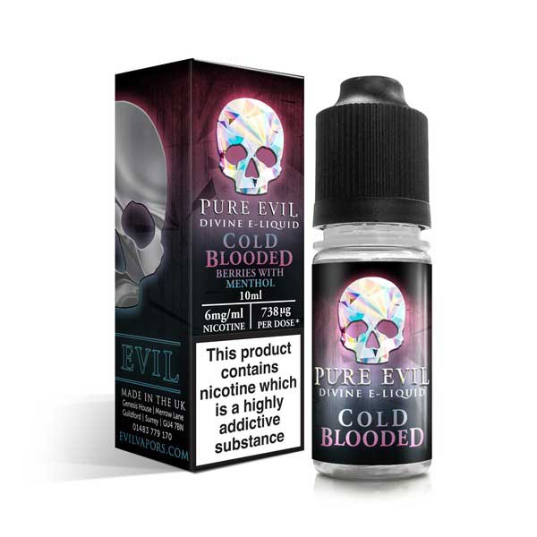 Cold Blooded is Pure Evil’s new serial chiller from the 7 Deadly Sins Collection. Mixed berries and ice cold mint provide a delicious flavour that’s as sweet as it is fresh. Perfect for cloud chasers and sub-ohm vapers.Specifications 10ml E-Liquid 80% Vegetable Glycerin (VG), 20% Propylene Glycol (PG) Available in 0.0%, 0.3% and 0.6% nicotine strengths Suitable for sub-ohm devices onlyAbout Pure Evil Made in the UK by industry-leading experts Vapour Labs, Pure Evil is their bestselling range of maximum VG e-liquids for great taste and maximum vapour. Flavours are inspired by the seven deadly sins to help satisfy your desires and create sinfully good cloud with sub-ohm setups.