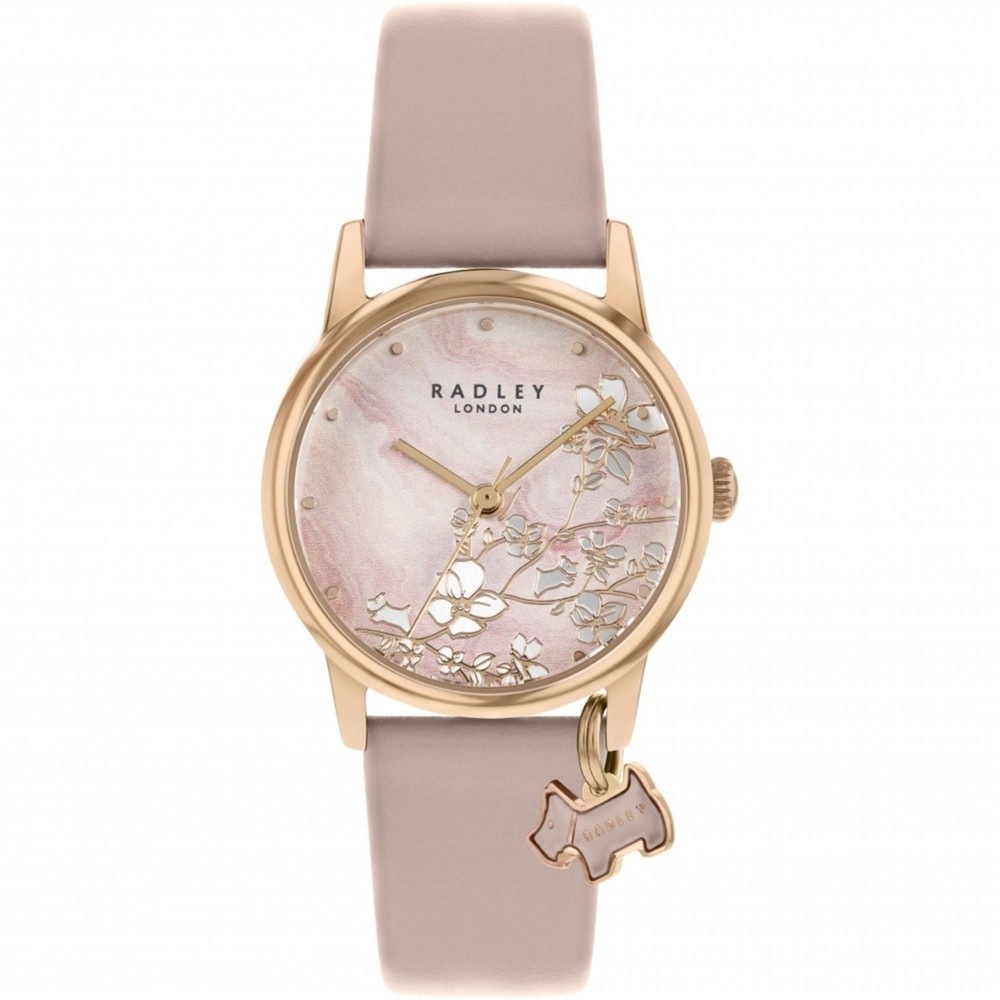 RY2884 Women’s Botanical Floral Wristwatch Guarantee – 2 year Case width – Approx – 30 mm Case depth Approx – 8 mm Gender – Women’s Dial Colour – Pink Case Material – Rose Gold Tone Stainless Steel Strap type – Leather Strap colour – Beige Water resistance – 30 metres Movement – Quartz (battery)Radley women’s watch with a rose gold tone stainless steel case. Pink dial with rose gold tone hands detailing. Finished with a beige leather strap. The brand’s iconic dog charm, hanging off the case We are a Radley UK authorised dealer Brand new boxed stock with full retail boxes & paperwork 2 year warranty