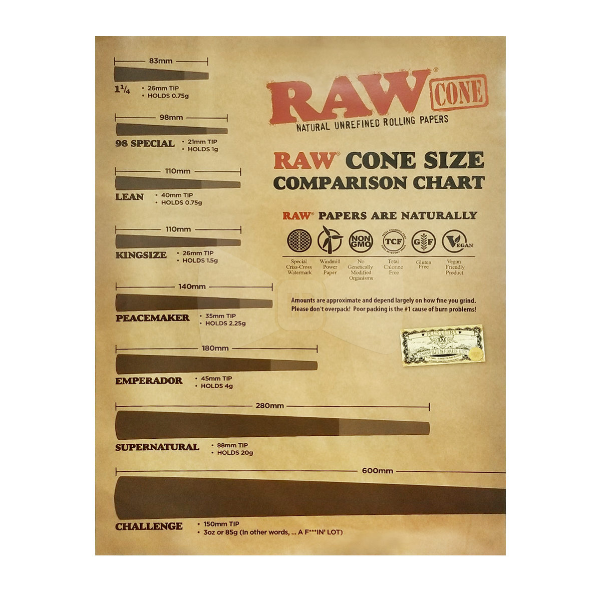 Show off your RAWthentic knowledge and sense of style with this RAW Cone Comparison Poster by RAW. This poster will help to categorize your smokes in the best way– by size! As an added benefit they also included how much product it would take to fill each cone so you can plan appropriately, no more guessing! Our trusty resident Butler thinks this poster is the perfect example of functional decor! This poster is 18″ x 24″. Show off your RAW pride everywhere you go with a RAW “Taste Your Terps” t-shirt !