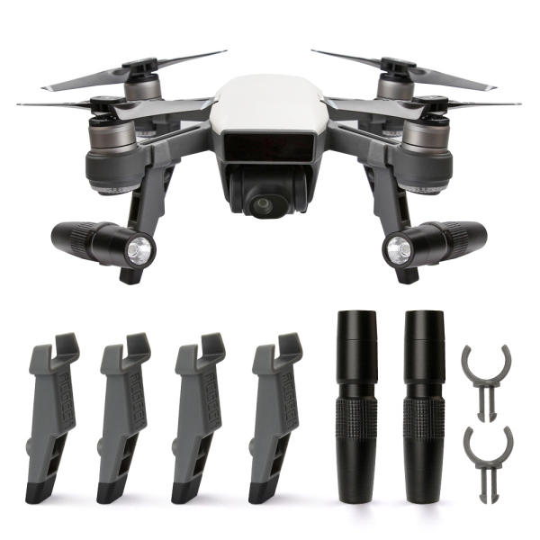 Rcgeek Extended Damping Landing Skids Landing Gear LED Headlamp Light Set For DJI SparkDescription:Brand Name: DJiItem No.:SparkItem Name:Landing Skids LED Headlamp Light SetSupport battery model: AAA batteryUsage for DJI SparkRC QuadcopterFeatures:Precision design,buffering silica gel foot pad, anti-dropTo prevent the gimble will be dirty or damage when taking off or landingLight LED, amazing in day or night. Long discharge time.High strength PAGF plastics injection from a complete moldUndamaged installation,Quick release designWith no need to disassemble the landing gear extensions, be convenient for travelingMax lumen:115lm,max lighting distance15 meter3 light model:high light,dim light,flashing lightPackage Included:* Landing Skids:4 xLanding Skids*Landing Skids+ Streak Lights:4 xLanding Skids 2 x Streak LED Headlamp Light* Landing +GridlinesLights:4 xLanding Skids 2 x GridlinesLED Headlamp Light