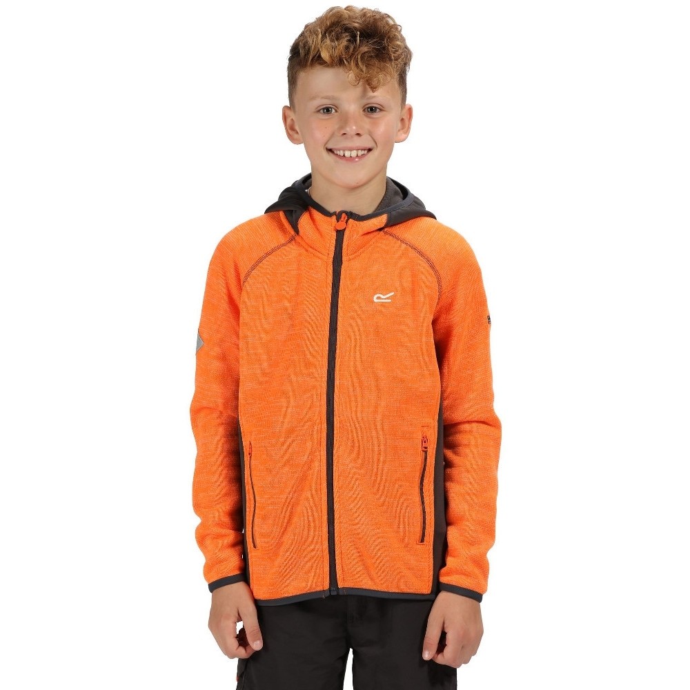 The Regatta Boys & Girls Dissolver II Jacket is designed from 280gsm 100% polyester marl knit effect fleece to keep you comfortable and warm all-day long. The Extol stretch side panels make it ideal for high energy outdoor activities. Additionally it features a grown-on hood and 2 zipped lower pockets., 280gsm 100% polyester marl knit effect fleece., Extol stretch side panels., Grown on hood., 2 zipped lower pockets., Stretch binding to hood opening cuffs and hem.