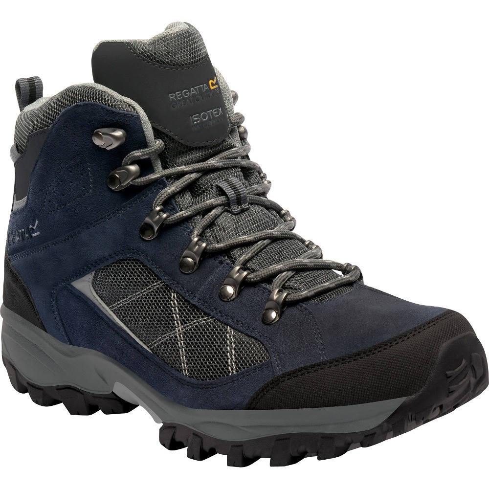 Whatever be the weather the Regatta Mens Clydebank Waterproof Breathable Mesh Walking Boots are the exact kind of footwear that you can rely upon. Showcasing a sturdy suede and mesh upper these walking boots exhibit the water shedding Hydropel technology with Isotex membrane to keep your feet dry. Equipped with the DuoPoint sole technology they help minimize shock and fatigue., Isotex waterproof footwear – seam sealed with internal membrane bootee liner. Hydropel water resistant technology., Waterproof suede and mesh upper. Deep padded collar and tongue for all day comfort., Die cut EVA footbed for underfoot comfort and support. Stabilising shank technology for underfoot protection and to reduce foot fatigue., Lightweight rubber outsole featuring internal EVA shock pads for underfoot comfort protection and traction.,