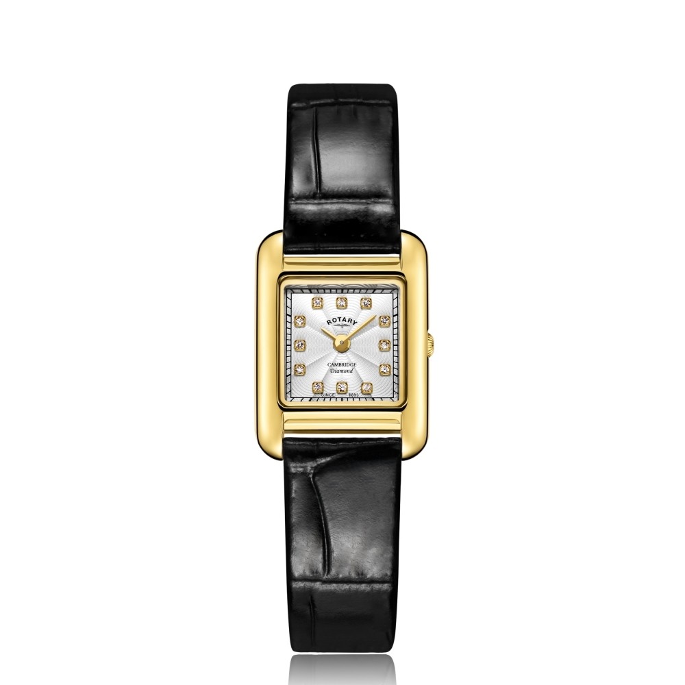 This stunningly petite diamond offering from the Cambridge family has a 19.5 x 26mm gold PVD Stainless Steel case with a silver white dial and 12 diamond hour markers, encased within scratch resistant sapphire glass. It has a black, genuine leather strap, secured with a Rotary buckle. It is water resistant to 50m.