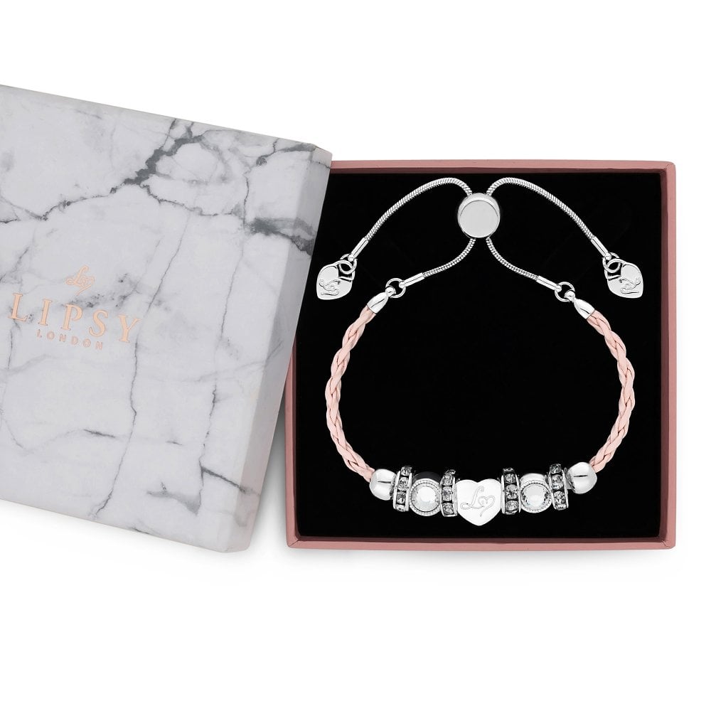 Silver Plated Charm Braclet With Pink Plait Strap – Gift Boxed