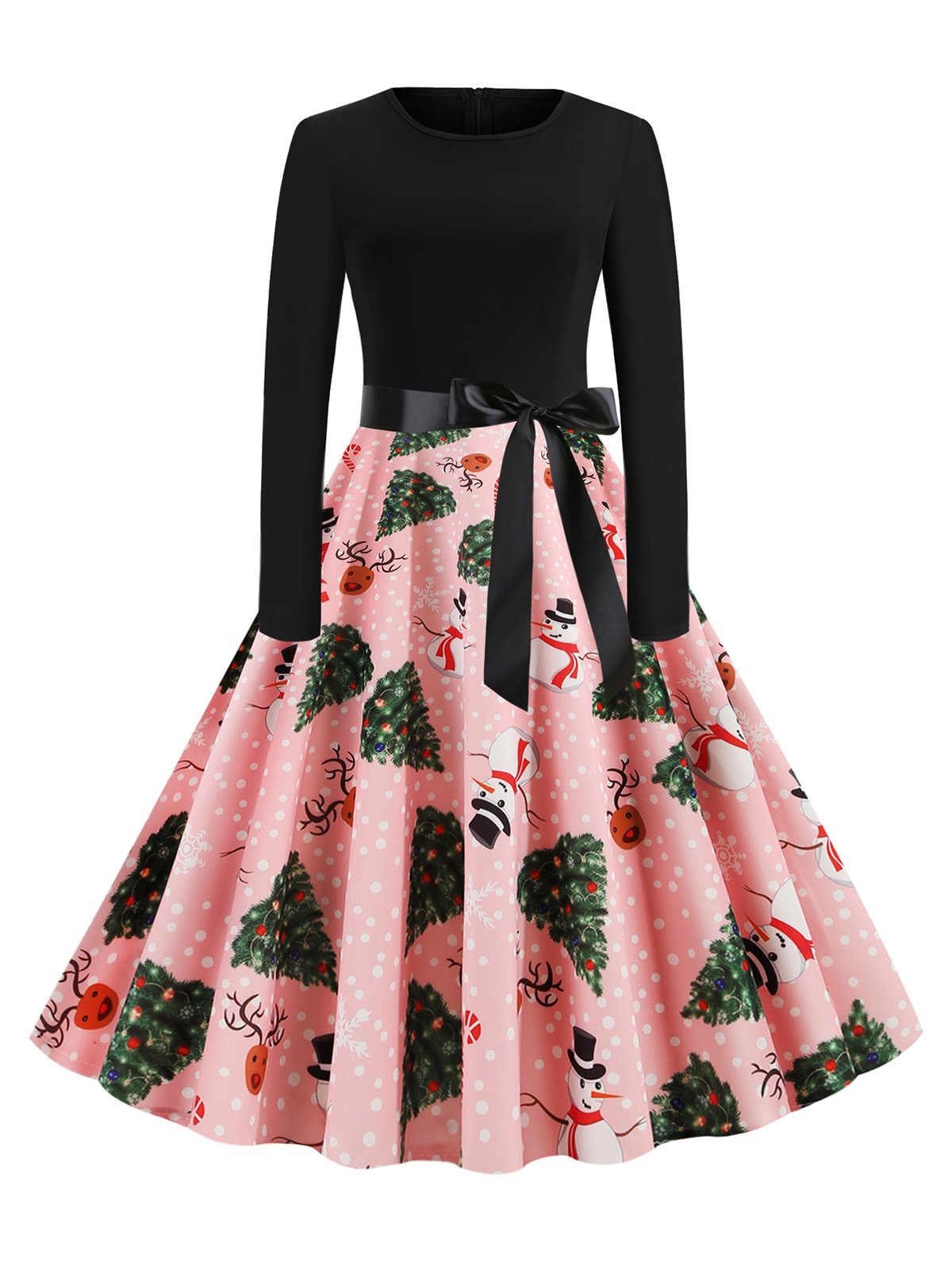 Snowman Elk Dotted Christmas Tree Belted Dress