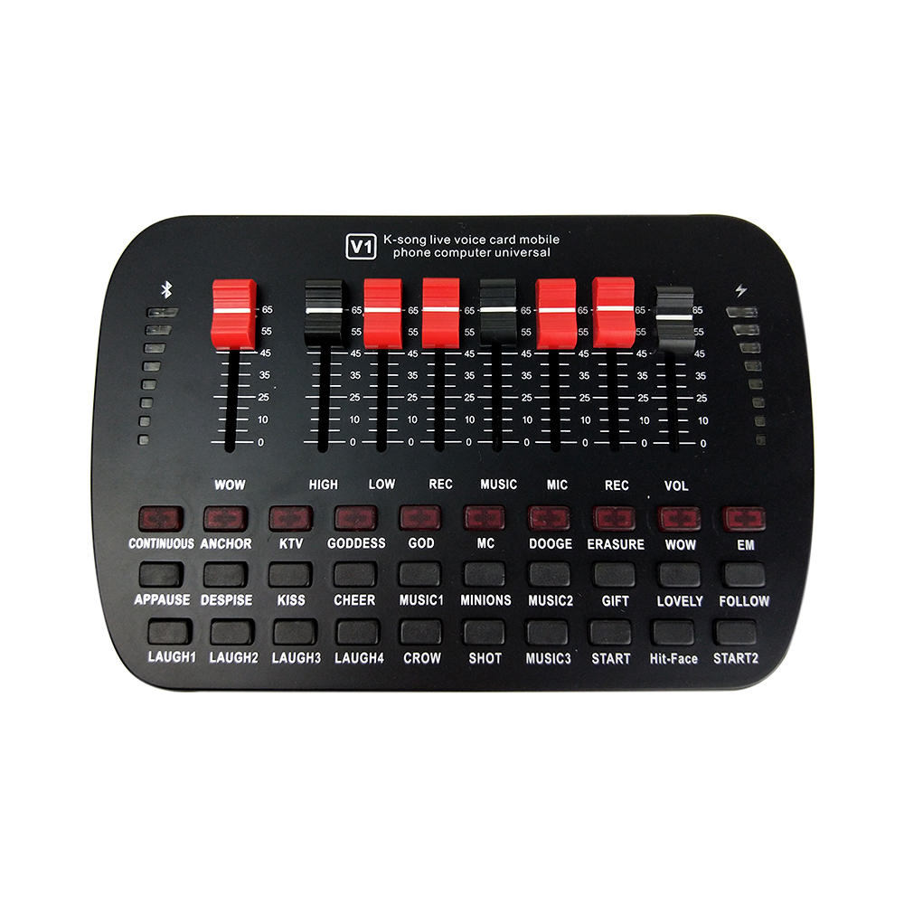 SNQISY V1 Live Sound CardDescription:This multi-functional live sound card has20 kinds of live sound effectsand12 kinds of electric musicand12 kinds of modeswhich can meet your different need.Features:Made of high-quality material with slim and lightweight design.Universal function, supports multi-function such as singing, live, recording, music and so on.Compatible with most smartphone, PC and laptop.Supports major mainstream live broadcast software.Supports connecting two earphones and two microphones at the same time.Supports wireless BT function.20 kinds of live sound effects and 12 kinds of electric music.Supports optimize sound.Built-in Chinese operation voice prompt.Can be used for live recording, home KTV, voice chat, and more.Specifications:Material: metalColor: pink, black (optional)Item size: 175 * 115mm / 6.89 * 4.53inPackage size: 250 * 145 * 55mm / 9.84 * 5.71 * 2.16inPackage weight: 500g / 1.1lbPackage List:1 * Live Sound Card2 * Audio Cables1 * USB Charging Cable1 * User ManualNote:1.Due to the different display screen and light effect, the actual color of the item might be slightly different from the color showed on the pictures.2.Please allow 10-20mm measuring deviation due to manual measurement.