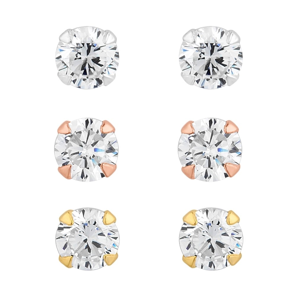 Sterling Silver 925 Tri-Tone Cubic Zirconia Stud Earring – Pack of 3