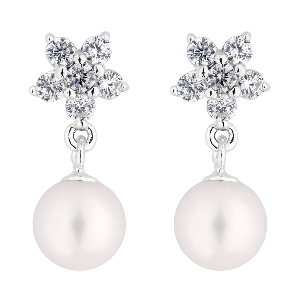 Sterling Silver 925 White Freshwater Pearl Floral Drop Earring