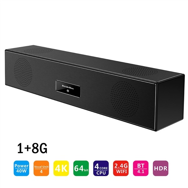 Operating System: Android 6.0 Chipset: Amlogic S905X Output Resolution: 4K RAM: 1GB NAND Flash: 8GB Multifunction: HDMI 2.0, Bluetooth CPU: Cortex-A53 GPU: Penta-core ARM Mali-450 Processor Frequency: 2.0GHz Interface: RJ45, USB 2.0, DC port, HDMI Bluetooth: Bluetooth 4.1 Wi-Fi: 2.4G Google Play Store: Support Support Language: Multi-language Model: STRIDEBOX Z1 Power: 40W Vocal Unit: 4 Distance: Within 15m Ethernet: 100M Video Supported: HD MPEG1/2/4, H,265, 4K-HD, HD AVC/VC-1 RM/RMVB Xvid/Div X3/4/5/6, ReaMdeo8/9/10 Avi/Rm/ Rmvd/Ts/Vob/MKV/MOV/ISO/WMV/ASF/DAT/MPG/ MPEG4K@60HZ video decoding 10-bit HEVC and AVS+codec support; H.264 up to 4K 30Hz Pre-installed Apps: my family cinema youtubes showbox skype facebook google play Netflix… Size: 520 x 117 x 117mm Weight: 1.53kg