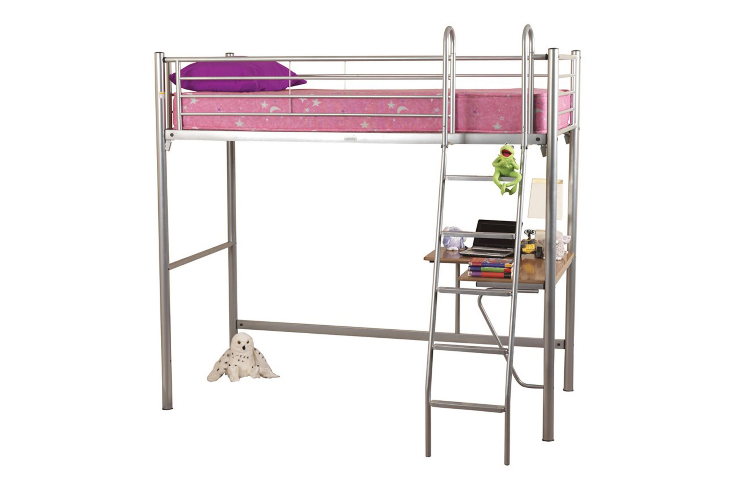 The Zeke is a superb metal high sleeper bunk bed from the high quality Sweet Dreams range. It features a sturdy metal construction and is finished in beautiful silver. A 5 step vertical angled ladder allows easy access to the upper sleeping area with metal mesh bases offering supreme mattress support. A desk is also located below the bed, which is perfect for homework or storage.