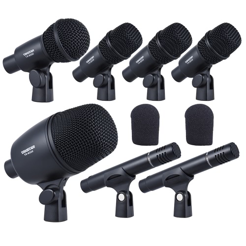 Features: Wired microphones kit designed for capturing the sound of percussion instruments. Including 1 big drum microphone, 4 small drum microphones and 2 condenser microphones. The big drum microphone is designed for bass drums and low frequency musical instruments. The small drum microphone is ideal for Tom-Toms and snare drums. And the condenser mic is excellent in capturing the sounds of cymbals and pianos. Low output impedance for long distance connection without compromising sound quality. Each microphone with XLR connectors to match most of audio instruments. Designed with standard thread 3/8 or 5/8 to match different types of microphone stands. Comes with a plastic carrying case with foam inlay for convenient carry and storage.