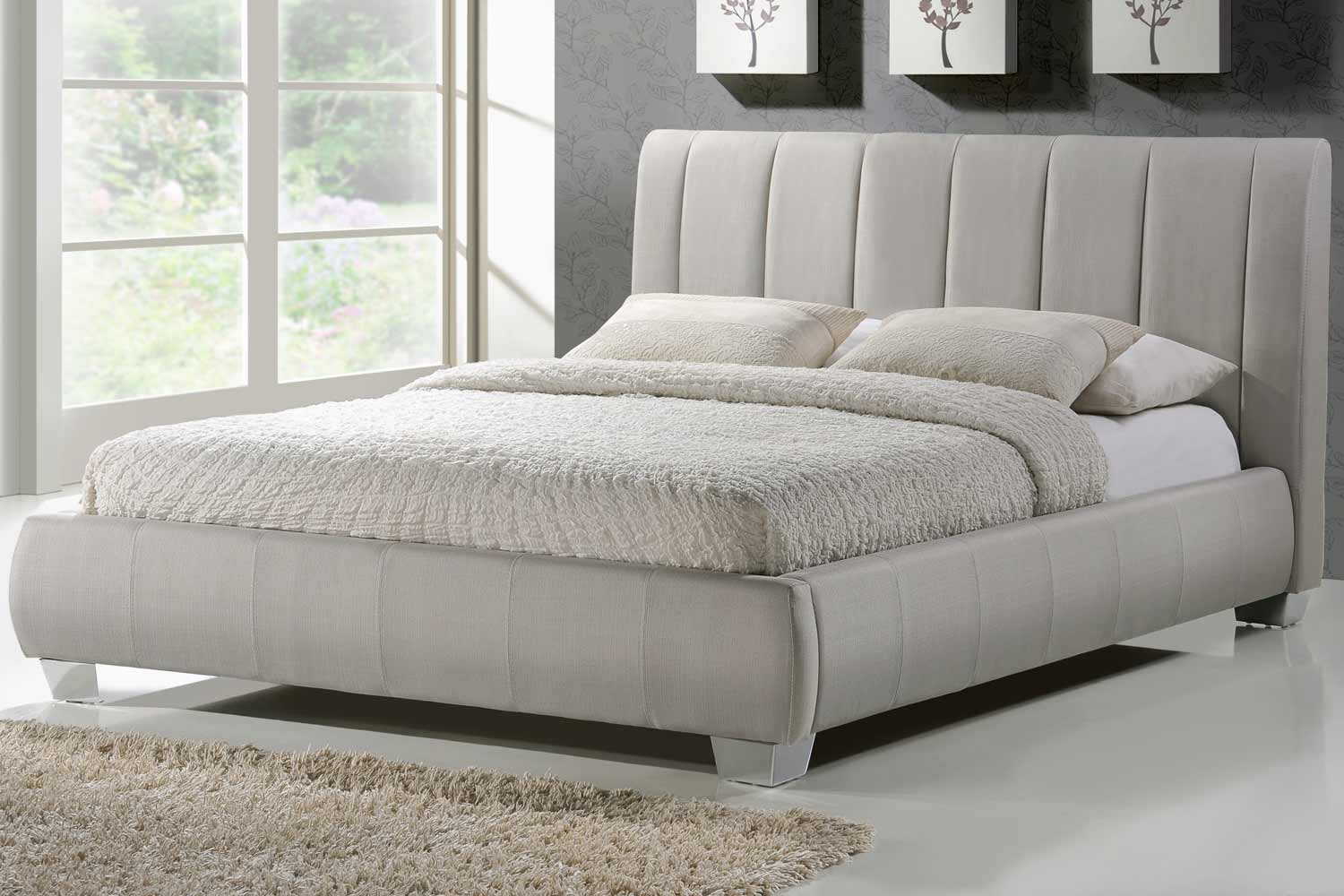 The Braunston Fabric Bed Frame is a fabulous addition to the high quality Time Living collection of bed frames. The frame features a stylish design which would be the centre piece of any bedroom. The Braunston features a deep padded headboard, low foot board and curved side rails. Clean stitching through out help complete the elegant look along with chrome corner feet and a textured sand fabric upholstery. A sprung slatted base completes the frame which provides extra mattress support and comfort.