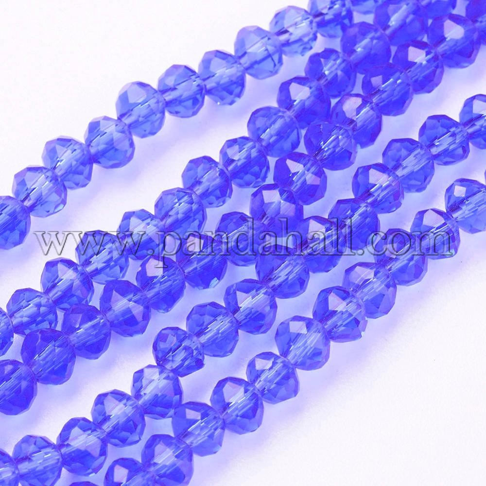 Transparent Glass Bead Strands, Faceted, Rondelle, MediumBlueSize: about 4mm in diameter, 3mm thick, hole: 1mm; about 140~145pcs/strand, 17″.Glass beads are shining and fascinating. Its decent appearance is full of beauty of pure and simple. Glass beads always give people a feeling of elegant and exquisite. It can be matched with hooks, jump rings, and pins to be necklaces, bracelets and so on.
