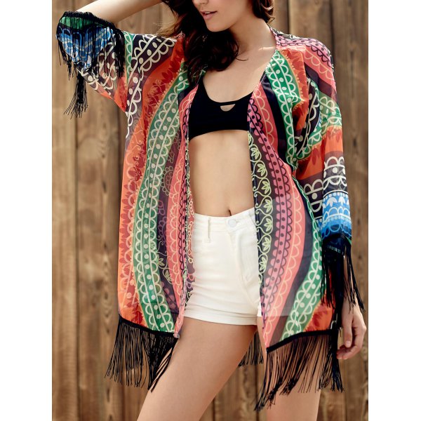 Trendy Collarless 3 4 Sleeve Printed Chiffon Tassels Kimono For Women